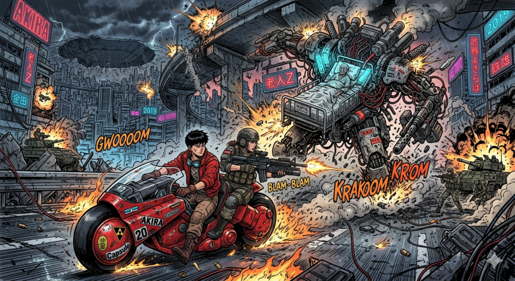 大友克洋が好きです アキラ 武器よさらば 老人Z を融合した画像を作ってください